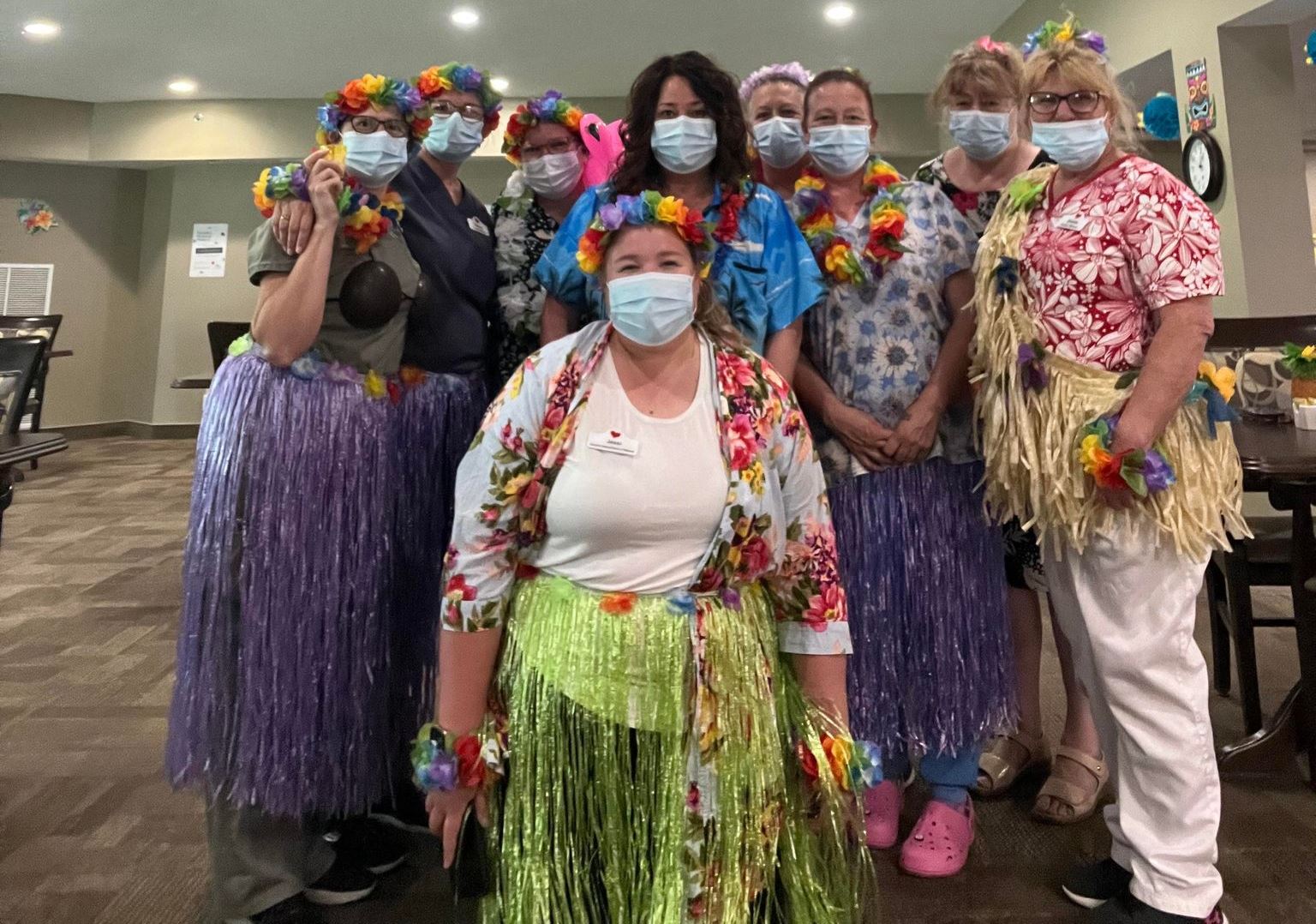 The staff at Southgate Village were looking to have some fun this summer and with the warm weather they decided to celebrate like they were in the Tropics! The day was organized by Susan the Fun Coordinator and a very delicious tropical meal was prepared by their Chef Karen. The residents had a great time as they were served pina colodas with their lunch and they all were greeted in the dining room with a "Lei" to wear for the day. It was a great way to shake things up a bit and put smiles on eveyones face as the staff had so much fun dressing up to come to work for the day!